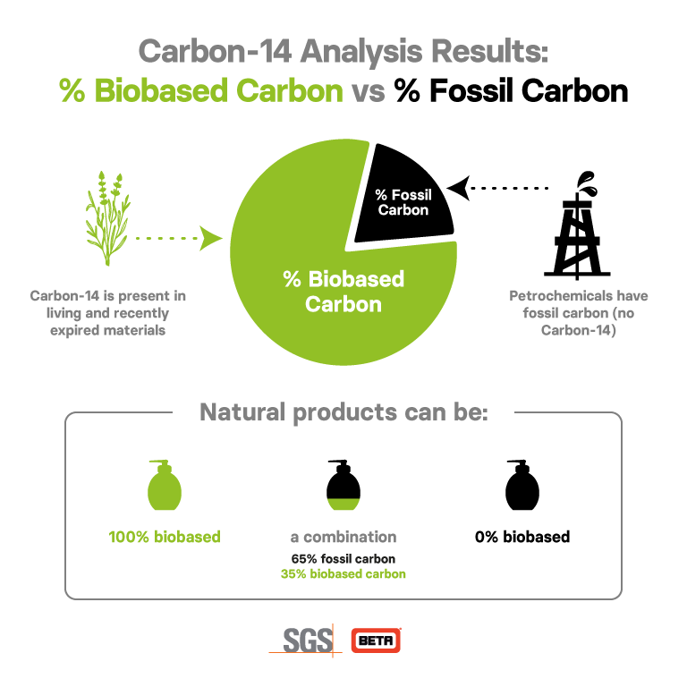 Also known as radiocarbon, Carbon-14 is a radioactive isotope found in all living things. It is ideal for measuring the biobased content of biomass-derived materials. Carbon-14 has a detection limit of 43,500 years before present (BP). The process of radioactive decay will degrade Carbon-14 that is older than this limit, meaning petroleum-derived components will not have measurable Carbon-14 left (Figure 1). Measurable Carbon-14 will only be detected in the portion of a sample that originates from recently living biomass. [5] Therefore, biobased testing is highly accurate because it directly measures the amount of biomass that comes from renewable sources.